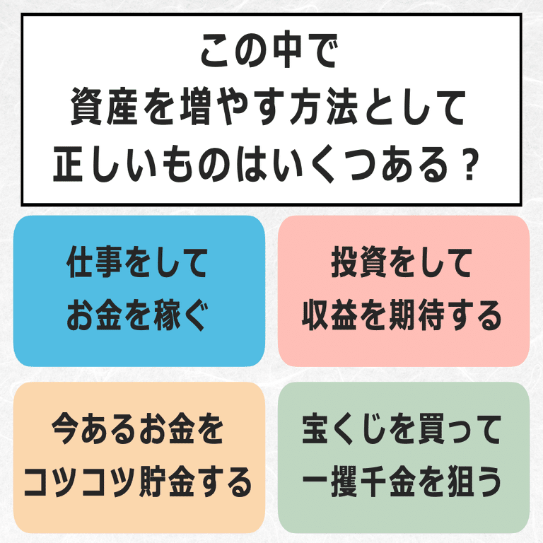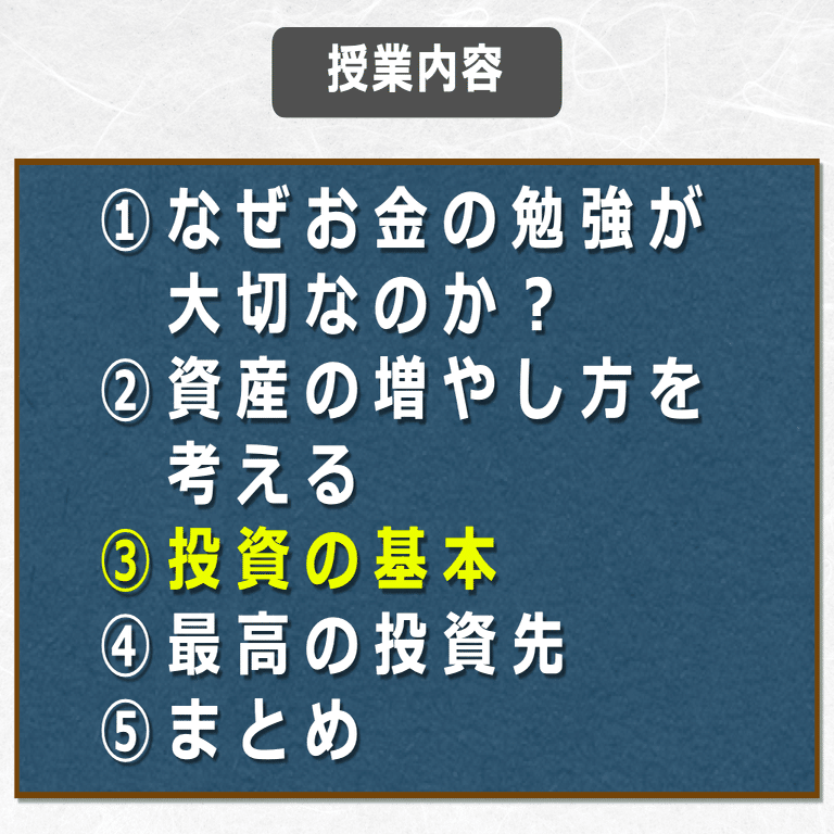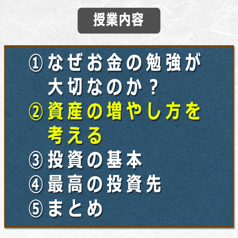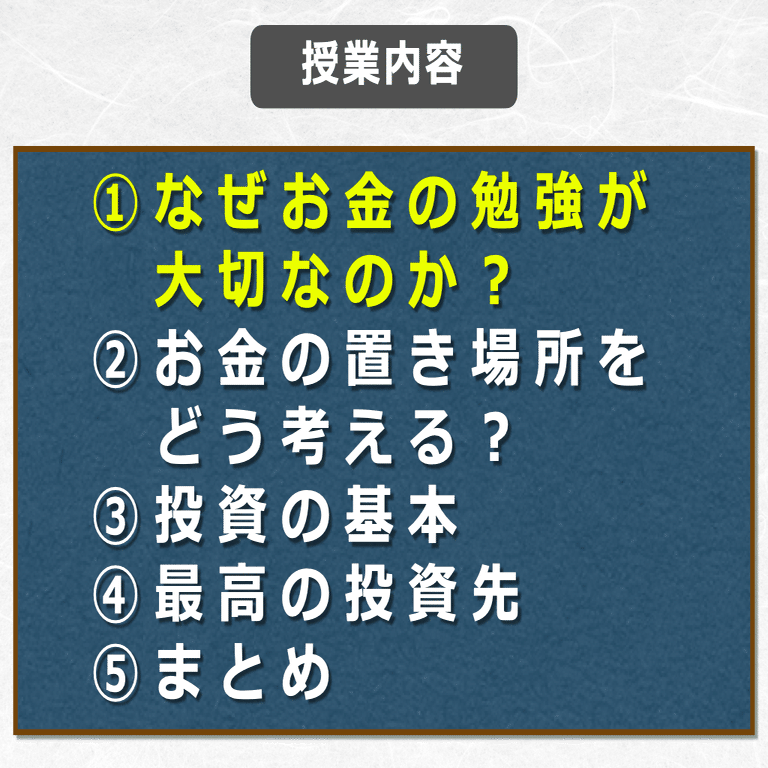 ここまでで授業はほとんど終わりです。流れで言うと、①お金の勉強がなぜ大切か?→②資産とはなにか?どんな増やし方があるか?→③投資には何があるか?→④最高の投資先はどこか?という感じになります。