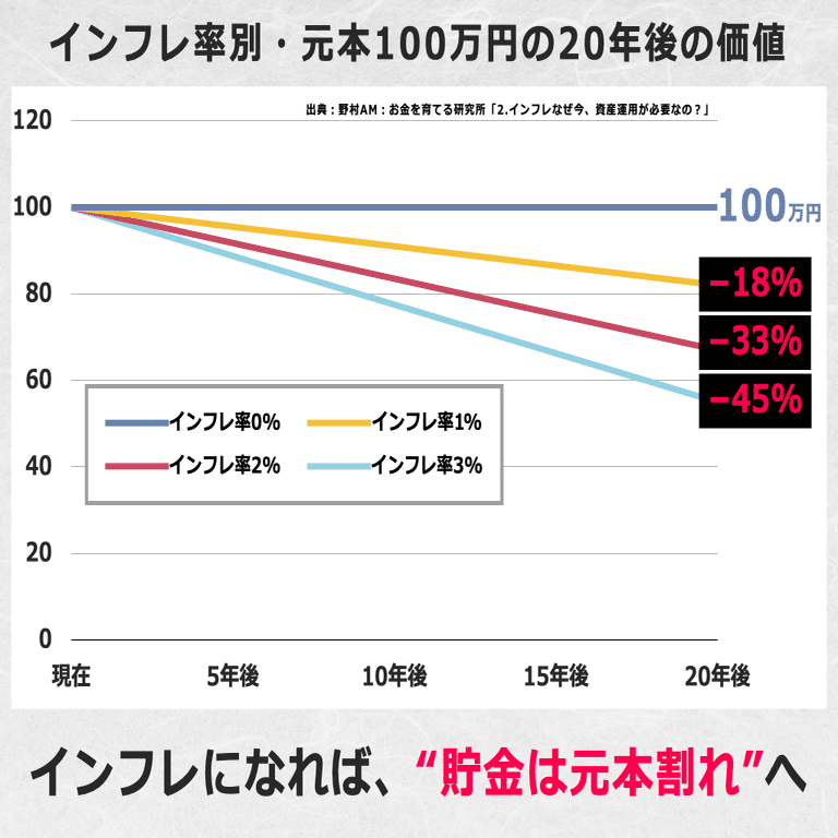 ところがここ数年で顕著になってきた“インフレの時代”に、その考えは合いません。なぜならインフレ下での預貯金は、減ってしまうからです。